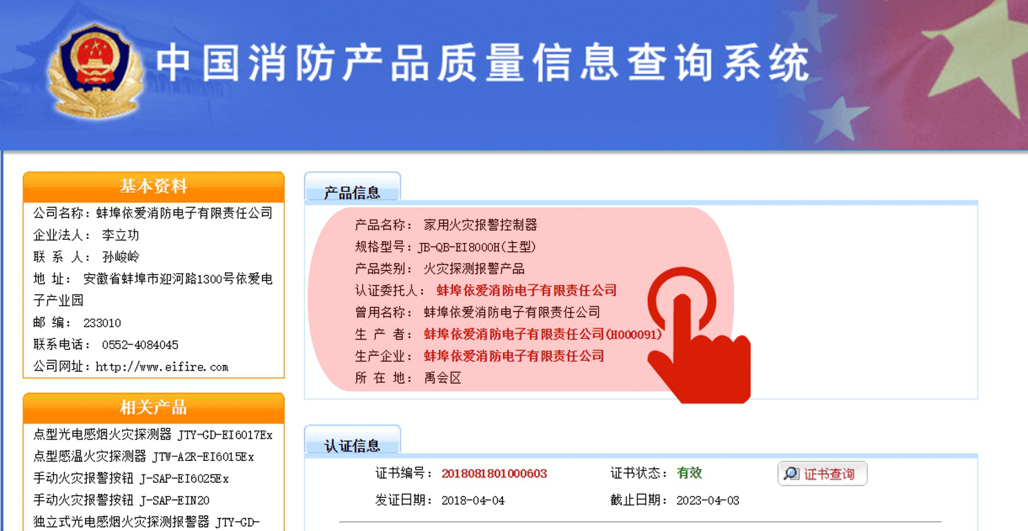 คลิกที่ผลิตภัณฑ์ที่เกี่ยวข้องเพื่อตรวจสอบใบรับรอง 3C ล่าสุดและข้อมูลรายงานการตรวจสอบเช่นคลิก "Home Fire Alarm Controller"