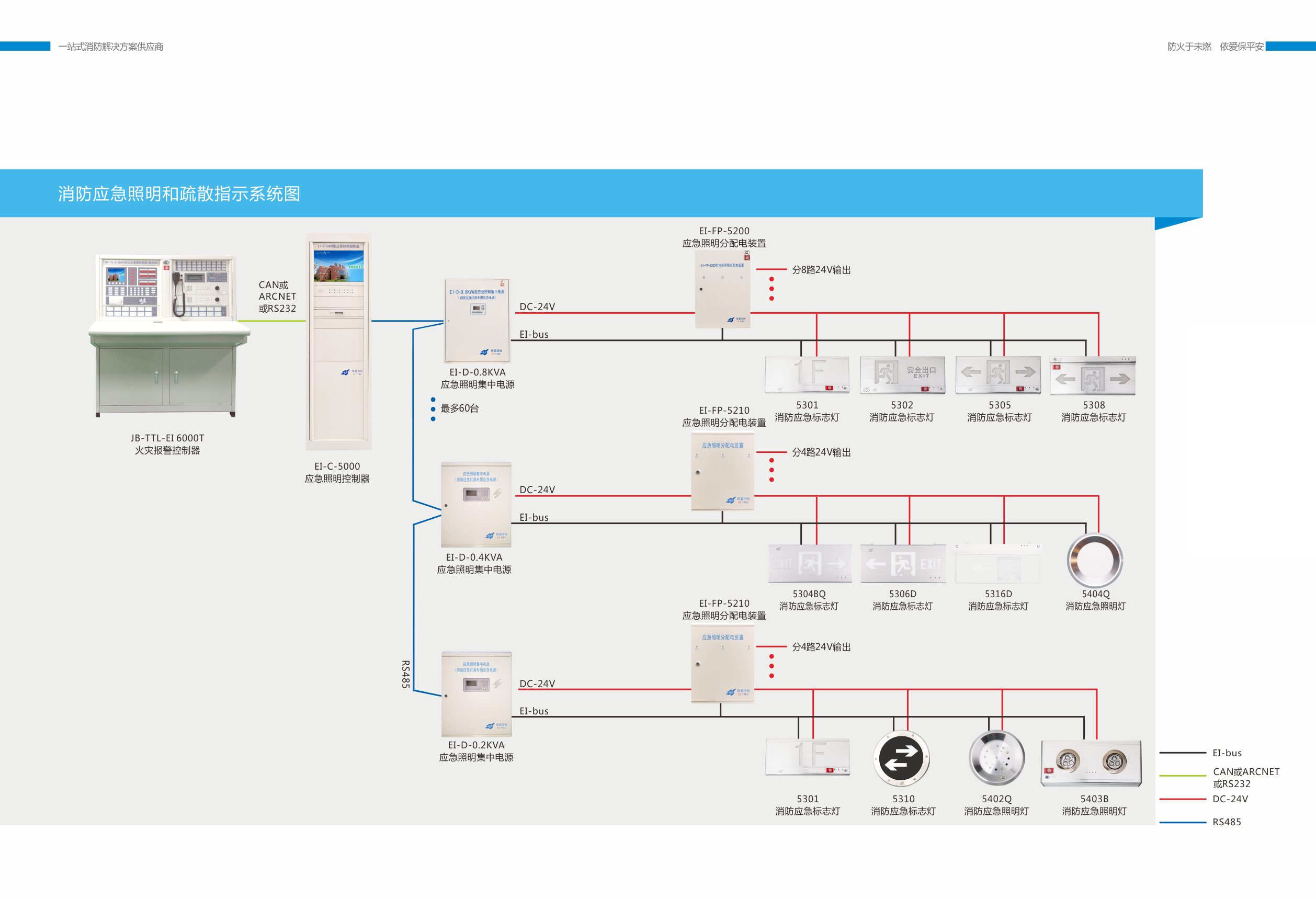 依愛消防應急照明和疏散指示係統主要包括EI-C-5000型應急照明控製器、EI-D-0.8KVA應急照明集中電源、EI-FP-5200型應急照明分配電裝置、5300係列集中電源集中控製型消防應急標誌燈具、5400係列集中電源集中控製型消防應急照明燈具等產品。