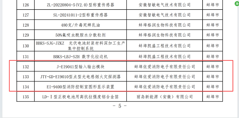近日,安徽省工業和信息化廳正式公示了《安徽省新產品(2025年第三批)擬確認名單》。經過各地推薦、專家評審和廳長辦公會審議,蚌埠依愛消防電子有限責任公司的J-EI9041型輸入輸出模塊、JTY-GD-EI9010型點型光電感煙火災探測器和EI-9400型消防控製室圖形顯示裝置三項創新產品成功入選,標誌著公司在智慧消防與電子技術領域的研發實力再獲權威認可。