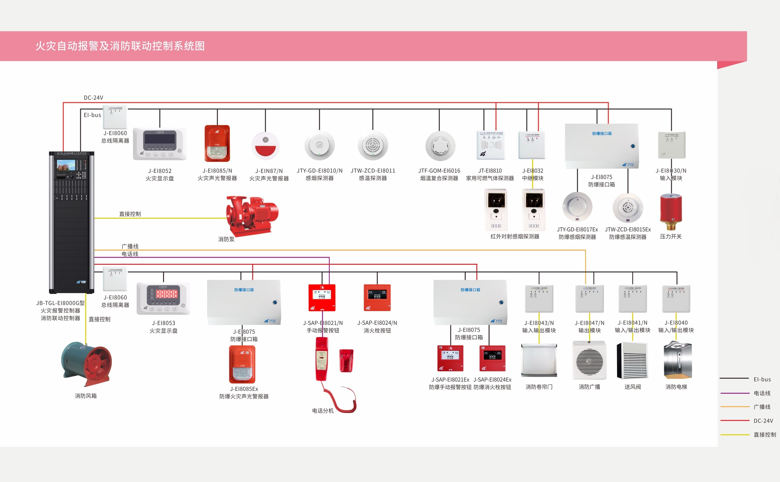 根據市場需求及實際運用情況,報警係統主要有火災報警控製器、氣體滅火控製器、可燃氣體探測器、感煙探測器、感溫探測器、手動報警按鈕、消火栓報警按鈕、聲光警報器、樓層顯示器等。